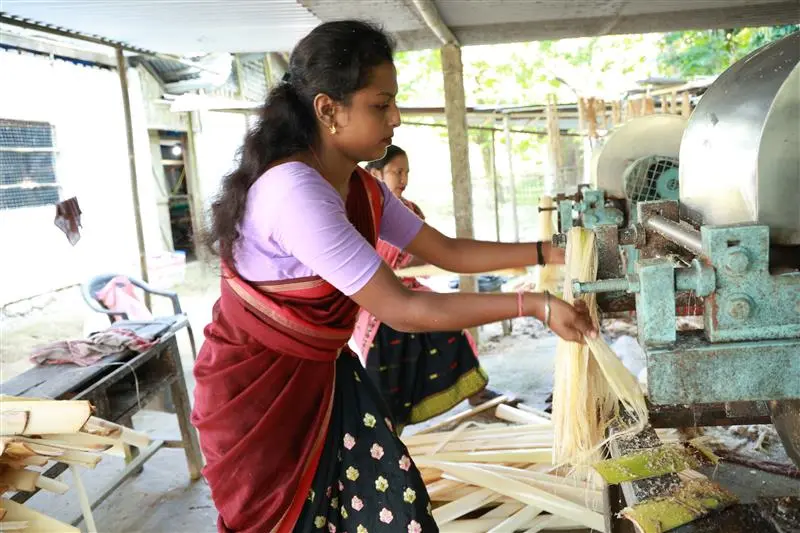 Jyotimoni decided to work with banana fibre. In a 12-day skill development training programme organised by the Project in Chamoguri village in Jorhat, Jyotimoni, along with twenty-nine other women, learnt to extract banana fibre and create marketable handicraft items from the fibre.
